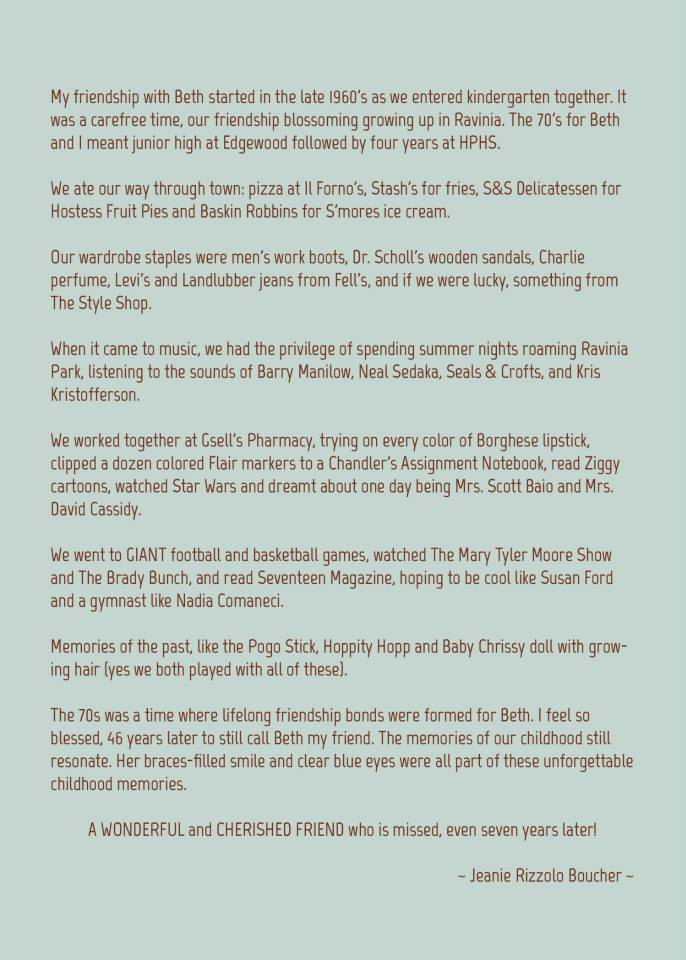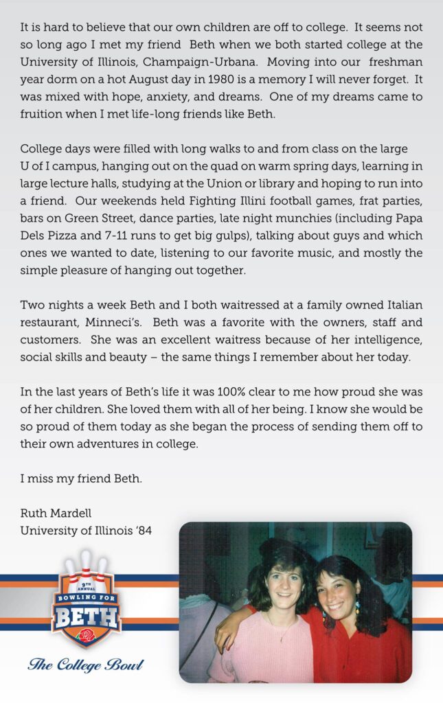 Beth was passionate about: advancement in healthcare, women in the workforce and education. She was extremely passionate about her philanthropic career at Rush Medical Center.